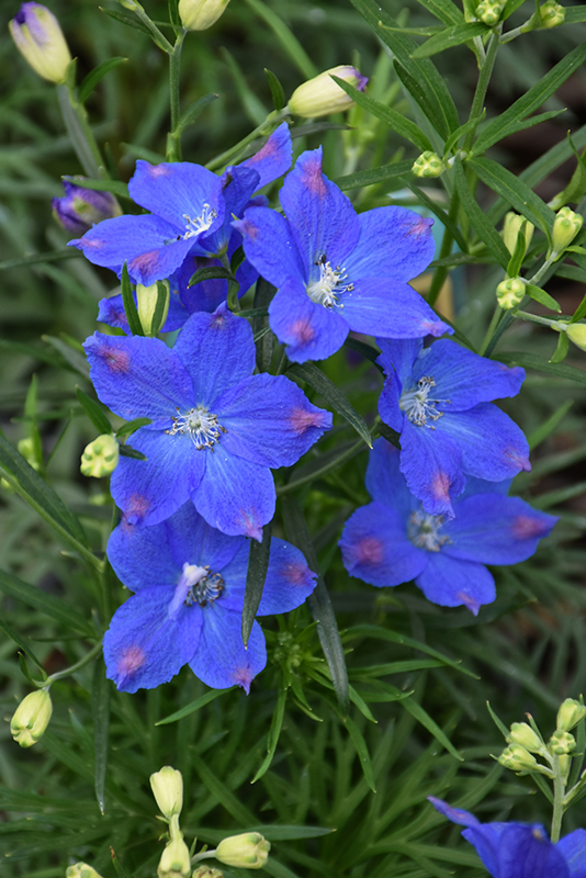 Blue Mirror Delphinium has masses of beautiful panicles of blue flowers with violet overtones at the ends of the stems from early summer to early fall, which are most effective when planted in groupings. The flowers are excellent for cutting. Its crinkled ferny compound leaves remain dark green in color throughout the season.