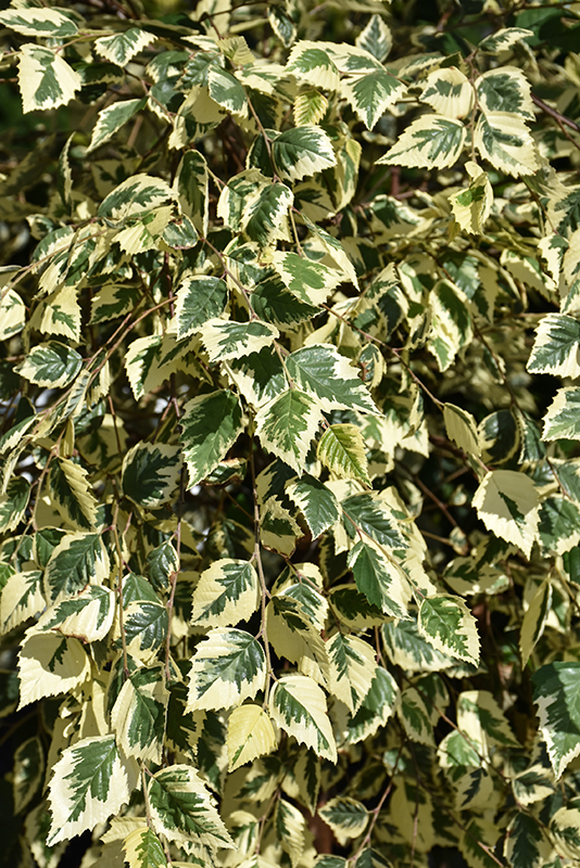 A visually stunning pyramidal to oval variety; smaller green leaves have wide irregular white margins; peeling bark exposes the brown under layer, for great winter interest; requires acidic soil, susceptible to chlorosis in alkaline soils