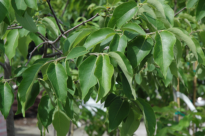 Common Persimmon will grow to be about 40 feet tall at maturity, with a spread of 35 feet. It has a low canopy with a typical clearance of 3 feet from the ground, and should not be planted underneath power lines. It grows at a medium rate, and under ideal conditions can be expected to live for 60 years or more. This is a female variety of the species which requires a male selection of the same species growing nearby in order to set fruit.