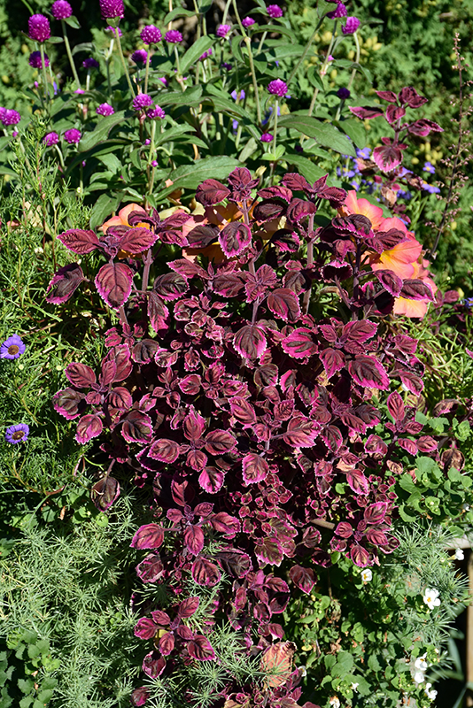 A beautiful trailing coleus, presenting small, deep purple leaves with bright plum colored edges; an excellent choice for hanging baskets, or cascading color from patio containers