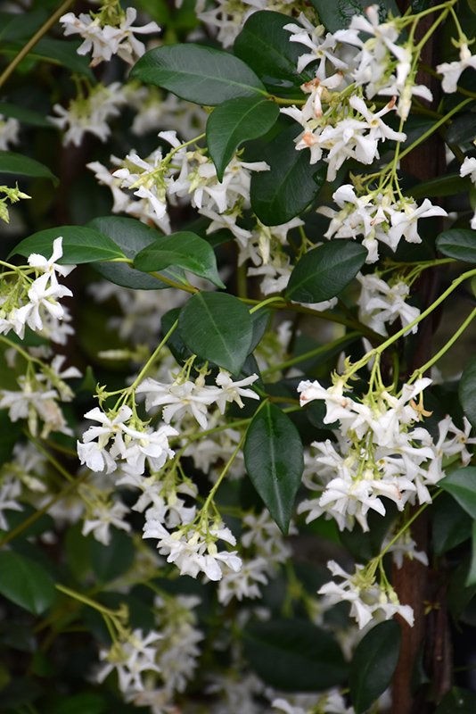 Confederate Star-Jasmine features tiny fragrant white tubular flowers along the branches from late spring to early summer. Its glossy pointy leaves emerge light green in spring, turning dark green in color the rest of the year.