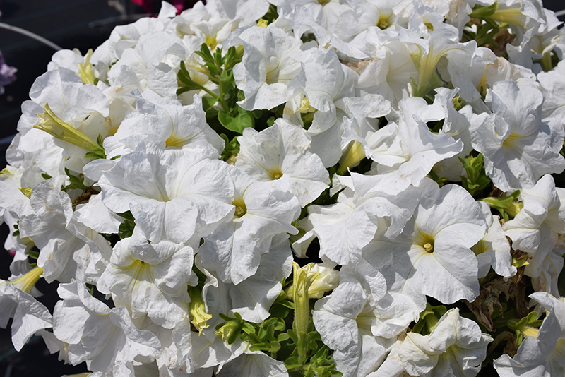 Duvet White Petunia is smothered in stunning white trumpet-shaped flowers at the ends of the stems from late spring to mid fall. Its pointy leaves remain green in color throughout the season.