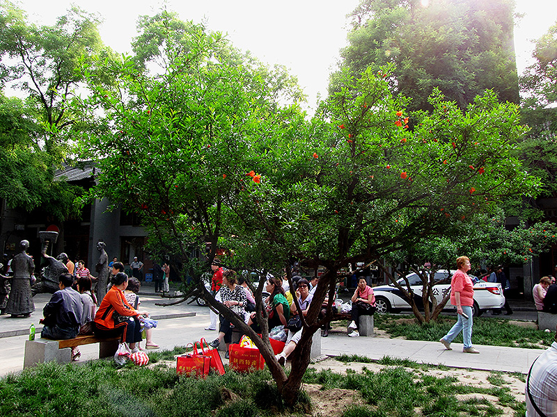 Pomegranate has nodding orange trumpet-shaped flowers at the ends of the branches from early to late summer, which emerge from distinctive tomato-orange flower buds, and which are interesting on close inspection. It has dark green deciduous foliage. The glossy oval leaves do not develop any appreciable fall color. The fruits are showy yellow pomes with a red blush, which are carried in abundance in early fall.