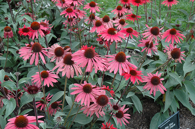 Big Sky™ Solar Flare Coneflower has masses of beautiful lightly-scented hot pink daisy flowers with orange overtones, coppery-bronze eyes and scarlet streaks at the ends of the stems from mid summer to mid fall, which are most effective when planted in groupings. The flowers are excellent for cutting. Its pointy leaves remain green in color throughout the season.
