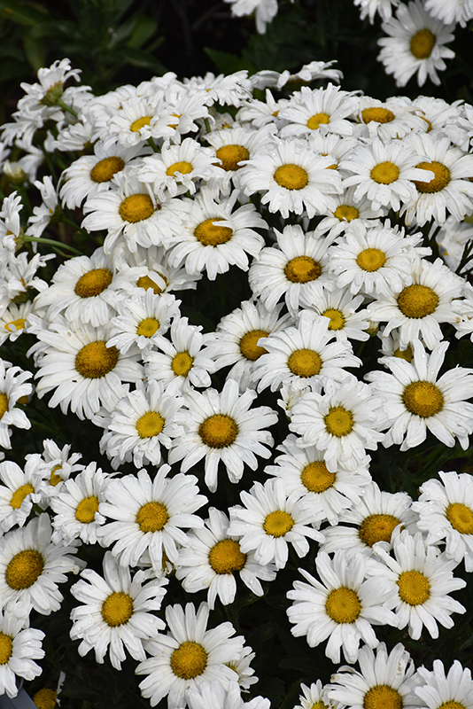 A delightful variety of the ever-popular shasta daisy; numerous beautiful white double blooms with yellow eyes rise above and graciously contrast the deep green glossy foliage; a wonderful choice to mass as a garden focal point
