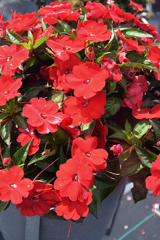 SunPatiens® Compact Red New Guinea Impatiens is a fine choice for the garden, but it is also a good selection for planting in outdoor containers and hanging baskets. It can be used either as 'filler' or as a 'thriller' in the 'spiller-thriller-filler' container combination, depending on the height and form of the other plants used in the container planting. It is even sizeable enough that it can be grown alone in a suitable container. Note that when growing plants in outdoor containers and baskets, they may require more frequent waterings than they would in the yard or garden.