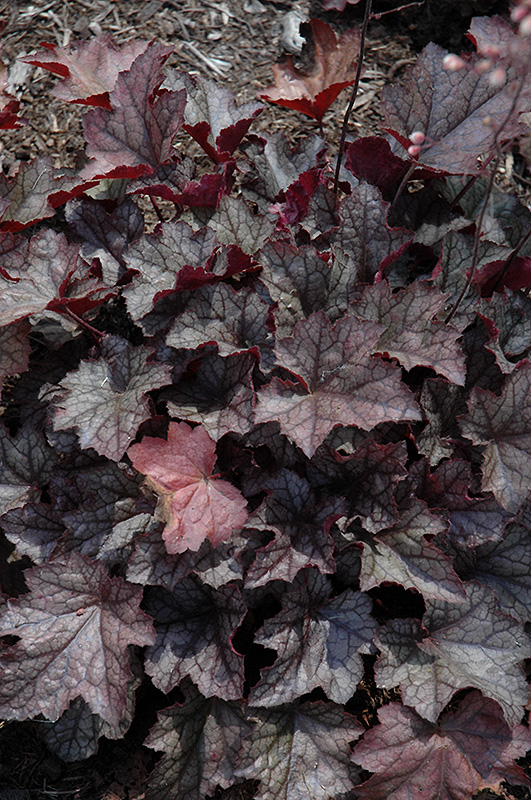Carnival Plum Crazy Coral Bells will grow to be about 12 inches tall at maturity, with a spread of 14 inches. When grown in masses or used as a bedding plant, individual plants should be spaced approximately 10 inches apart. Its foliage tends to remain dense right to the ground, not requiring facer plants in front. It grows at a medium rate, and under ideal conditions can be expected to live for approximately 10 years. As an evegreen perennial, this plant will typically keep its form and foliage year-round.