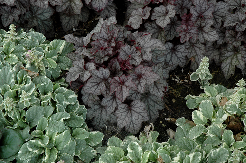 Carnival Plum Crazy Coral Bells is a dense herbaceous evergreen perennial with tall flower stalks held atop a low mound of foliage. Its relatively fine texture sets it apart from other garden plants with less refined foliage.
