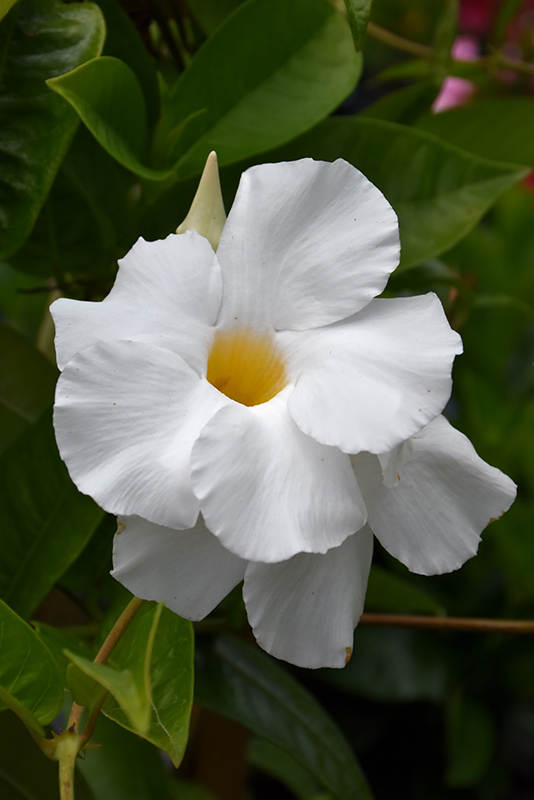 Sun Parasol® Giant White Mandevilla features bold white tubular flowers with harvest gold throats along the branches from late spring to mid fall. Its glossy pointy leaves remain dark green in color throughout the year.