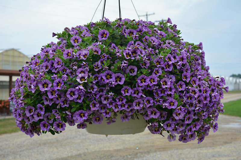 Superbells® Evening Star™ Calibrachoa is covered in stunning lavender trumpet-shaped flowers with yellow throats and a deep purple ring at the ends of the stems from late spring to early fall. Its small pointy leaves remain green in color throughout the season.