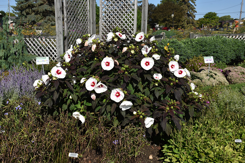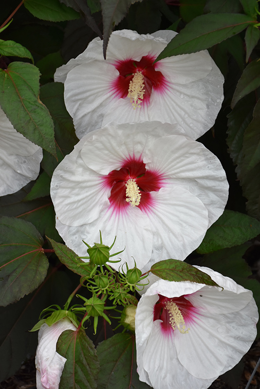 Showy, huge, lightly ruffled white flowers with deep scarlet eyes really make a bold statement opening above attractive dark bronze-green leaves; flowers are produced from the top to the bottom of the plant; do not allow to dry to wilting point