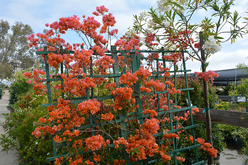 Orange King Bougainvillea will grow to be about 20 feet tall at maturity, with a spread of 24 inches. As a climbing vine, it should either be planted near a fence, trellis or other landscape structure where it can be trained to grow upwards on it, or allowed to trail off a retaining wall or slope. Although it's not a true annual, this fast-growing plant can be expected to behave as an annual in our climate if left outdoors over the winter, usually needing replacement the following year. As such, gardeners should take into consideration that it will perform differently than it would in its native habitat.