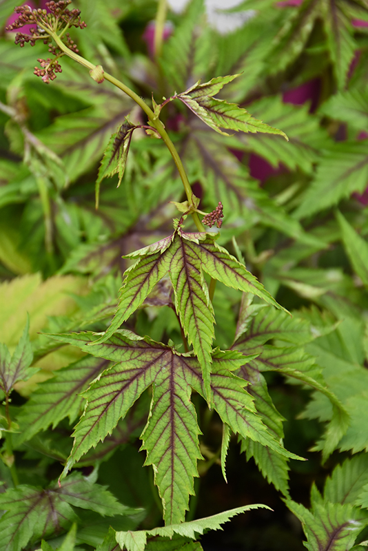 A unique selection with an upright habit; candyfloss-pink, feathery plumes held above attractive, lobed leaves, heavily veined with crimson; great for moist areas of the garden or waterside planting; will adapt to containers