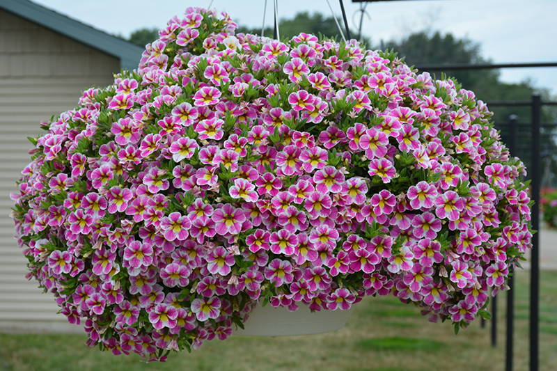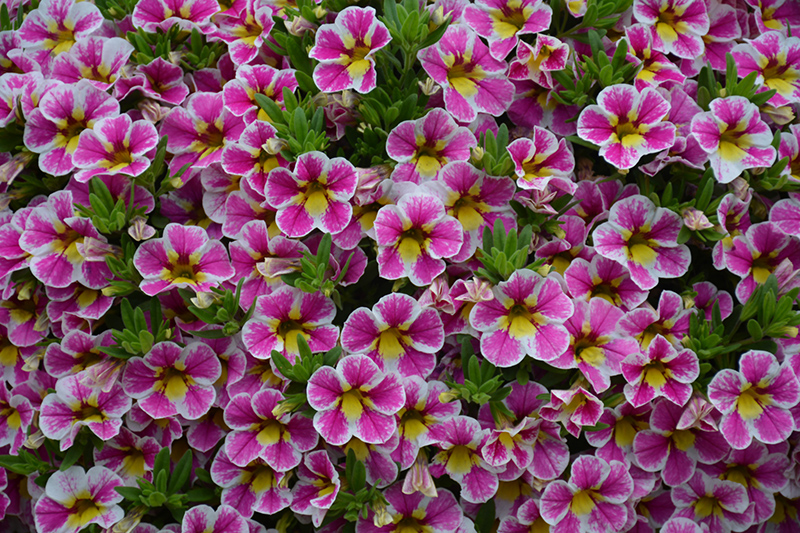 Superbells® Holy Cow!™ Calibrachoa is covered in stunning hot pink trumpet-shaped flowers with white overtones and yellow throats at the ends of the stems from late spring to mid fall. Its small pointy leaves remain green in color throughout the season.
