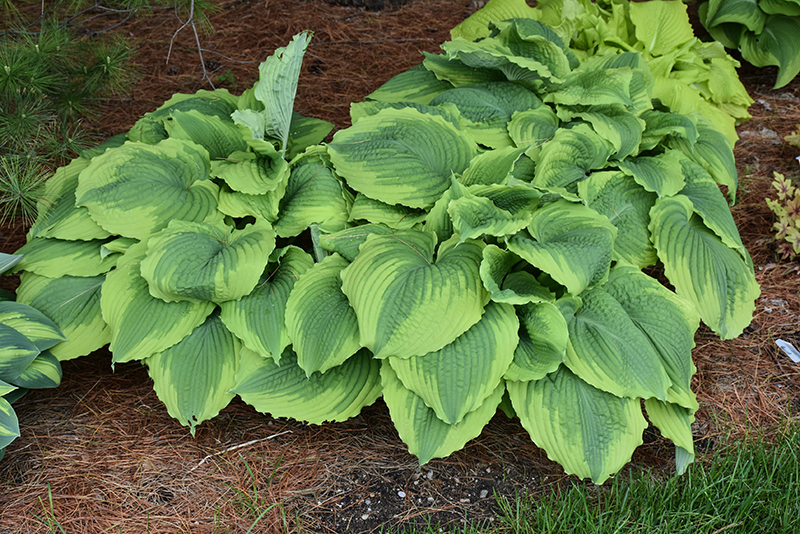 This attractive variety features deeply veined blue-green leaves that form a dome shape, with heavily rippled yellow margins; pale lavender flowers in early to mid-summer; a versatile, colorful addition to the garden or landscape