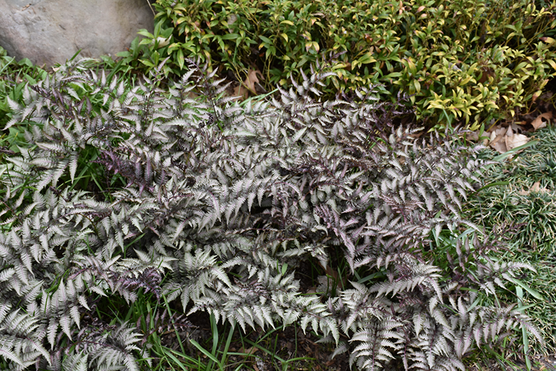 Pewter Lace Painted Fern will grow to be about 18 inches tall at maturity, with a spread of 24 inches. Its foliage tends to remain dense right to the ground, not requiring facer plants in front. It grows at a slow rate, and under ideal conditions can be expected to live for approximately 15 years. As an herbaceous perennial, this plant will usually die back to the crown each winter, and will regrow from the base each spring. Be careful not to disturb the crown in late winter when it may not be readily seen!