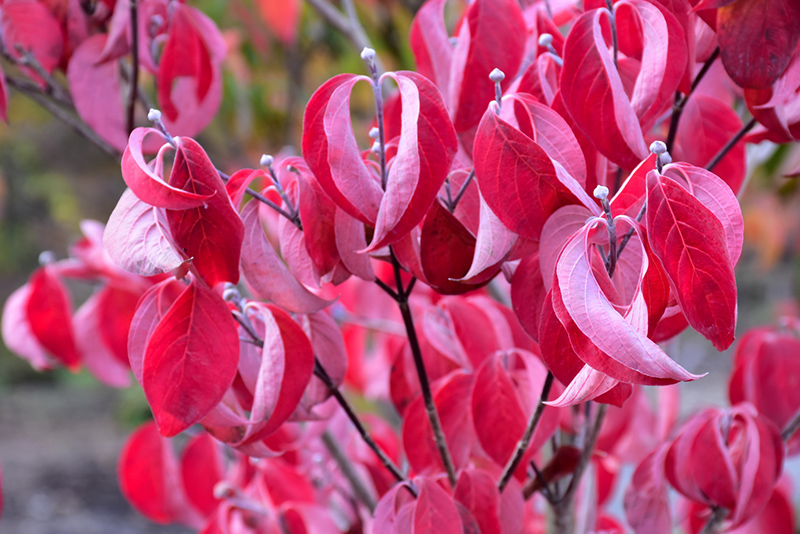 Cherokee Brave Flowering Dogwood features showy clusters of crimson flowers with white centers held atop the branches in mid spring. It has forest green deciduous foliage which emerges burgundy in spring. The pointy leaves turn an outstanding brick red in the fall. It produces red berries from early to late fall. The warty gray bark adds an interesting dimension to the landscape.