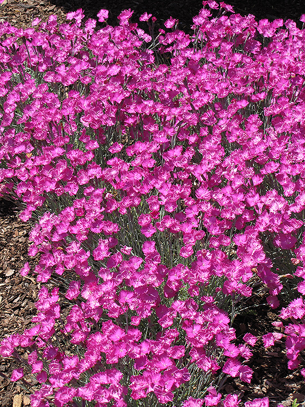 A robust variety bearing single, fuchsia flowers in late spring to early summer, over a cushion of blue-green, grass-like leaves; has a mild, clove-like, spicy fragrance; will sporadically re-bloom throughout the summer