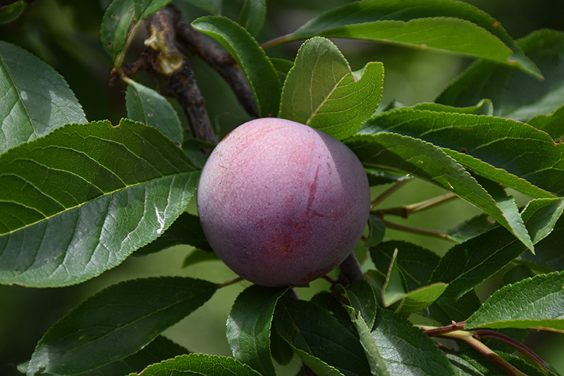 Methley Plum is a small tree that is typically grown for its edible qualities. It produces large crimson round fruit (technically 'drupes') with deep purple overtones and red flesh which are usually ready for picking from mid to late summer. Note that the fruits have hard inedible pits inside which must be removed before eating or processing. The fruits have a sweet taste and a juicy texture.