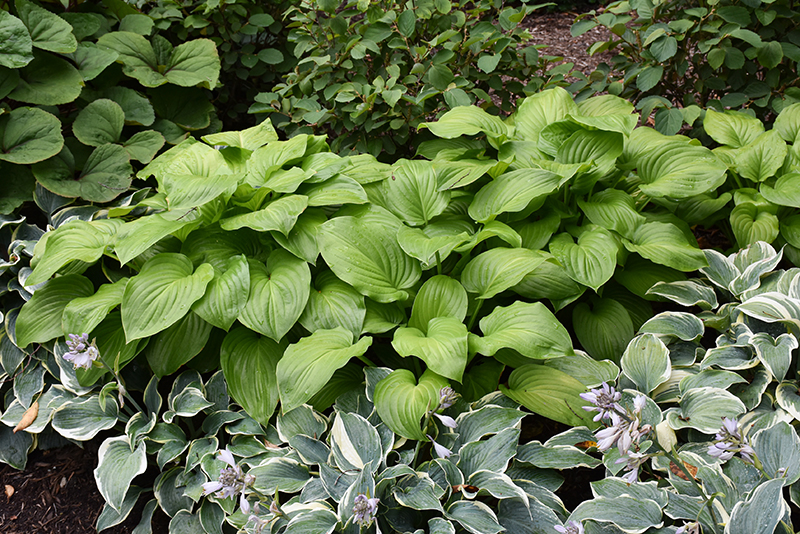 Guacamole Hosta features dainty spikes of white bell-shaped flowers rising above the foliage in mid summer. Its attractive large textured heart-shaped leaves remain chartreuse in color with showy emerald green variegation throughout the season.