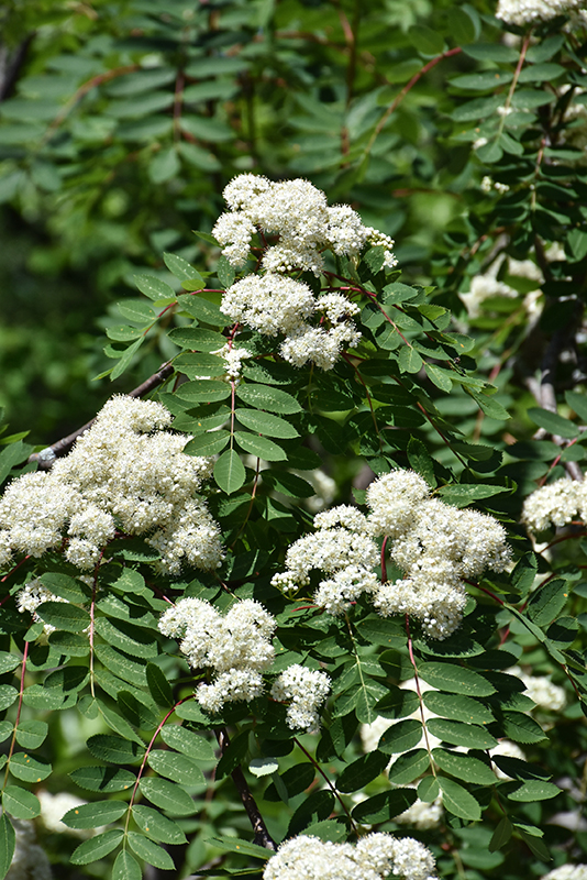 Showy Mountain Ash features showy clusters of white flowers held atop the branches in mid spring. The red fruits are held in abundance in spectacular clusters from early to late fall. It has dark green deciduous foliage. The oval compound leaves turn an outstanding red in the fall. The smooth gray bark adds an interesting dimension to the landscape.