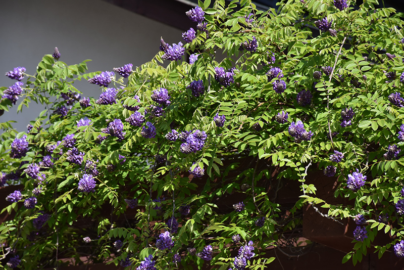 Blue Moon Wisteria will grow to be about 25 feet tall at maturity, with a spread of 8 feet. As a climbing vine, it tends to be leggy near the base and should be underplanted with low-growing facer plants. It should be planted near a fence, trellis or other landscape structure where it can be trained to grow upwards on it, or allowed to trail off a retaining wall or slope. It grows at a fast rate, and under ideal conditions can be expected to live for approximately 30 years.