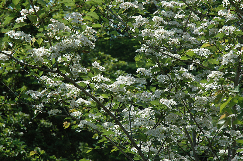 The new "in vogue" accent tree for home use, and with good reason; snowy white flowers in spring, an abundance of showy red fruit in fall, excellent fall color and a simply amazing criss-crossing branching habit; disease resistant, but very thorny