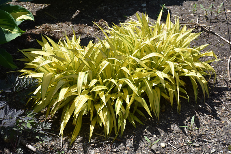 Grown for wide, grassy leaves; gold foliage with green edge; great in a moist border in shade or sun, does not like to dry out