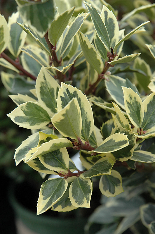 This is variegated mutation of Blue Maid Holly with attractive spiny blue-green foliage with cream edges; showy red berries in winter; requires a male plant within 100 feet