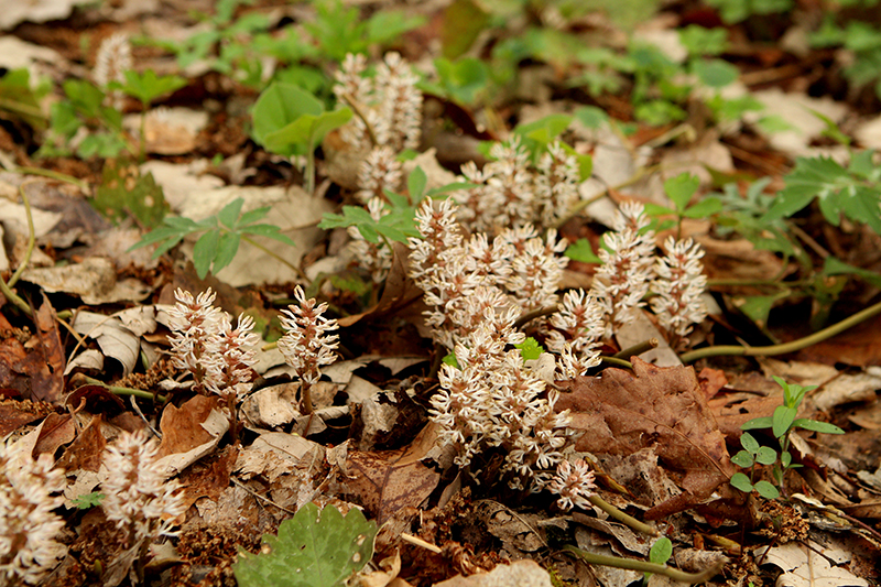 Allegheny Spurge features tiny spikes of lightly-scented white flowers rising above the foliage in mid spring. Its serrated pointy leaves remain dark green in color throughout the year.
