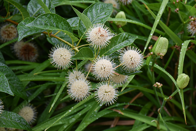 Button Bush features unusual lightly-scented creamy white ball-shaped flowers along the branches from early to late summer. It has green deciduous foliage. The pointy leaves do not develop any appreciable fall color.