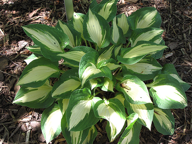 This variety presents nicely shaped pointed leaves that are butter yellow with a wide green margin; provides beautiful texture and contrast to other plants; lavender flowers on purplish-red scapes in mid-summer